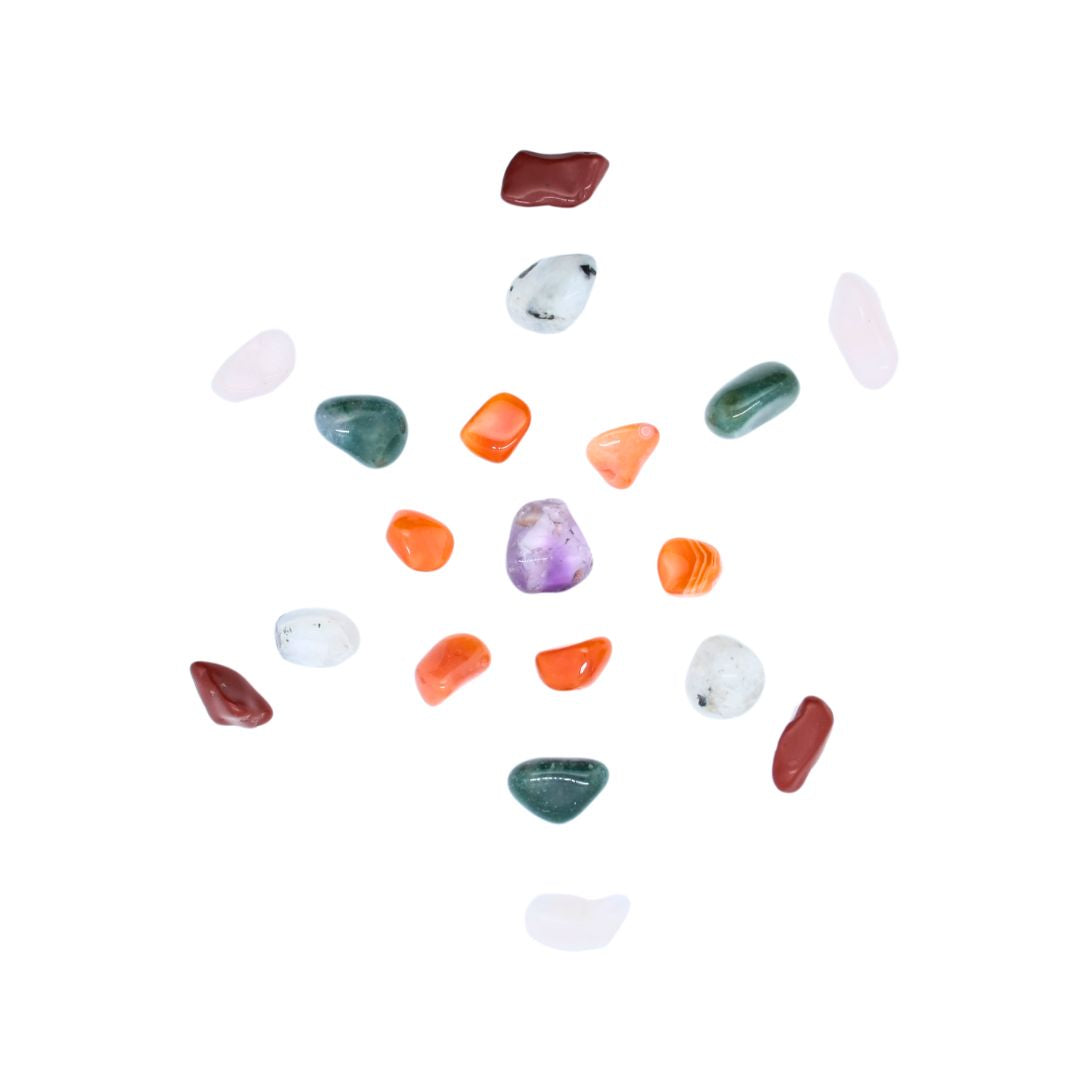 Deze edelstenen set bevat maar liefst 19 edelstenen, ideaal om je eigen krachtig grid samen te stellen en de energie te focussen. Met een kristal grid kun je de stenen in een geometrisch patroon leggen, waarbij elke steen met intentie wordt geplaatst om energie te bundelen en je doelen te ondersteunen. Of je nu een kalme bevalling wilt bevorderen, beschermende energie voor je baby wilt creëren, of meer vertrouwen wilt vinden in je nieuwe rol als moeder – deze set helpt je daarbij.
