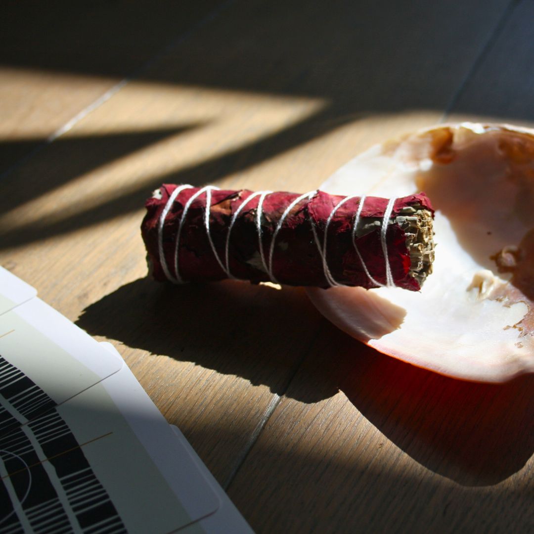• Steek het uiteinde van de smudge aan, blaas het vlammetje uit en laat de kruiden zachtjes smeulen.